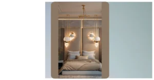 That ceiling light looks like it’s trying to escape the room – maybe it’s tired of watching you sleep! Jokes aside, this bedroom interior design is pretty sweet. The colors are calm, the bed looks super comfy, and those round mirrors hanging on the wall look like a fun detail. It’s the kind of place where you could actually chill instead of just tossing your clothes on the floor…though no promises!