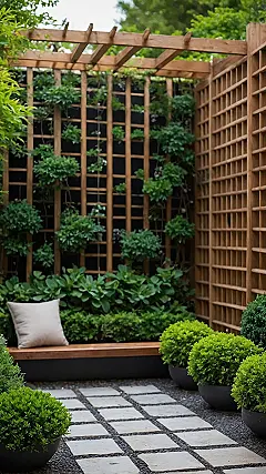 Need a chill spot that feels miles away without actually leaving? Check out this scene! It’s got that cool wooden trellis climbing up the wall, looking like a giant fancy ladder for plants who are probably trying to sneak out and grab pizza. And peep that cozy bench with the cushion – it’s practically begging you to sit there and pretend you’re in a secret hideaway in Italy, maybe planning your next move to avoid homework. It’s got major courtyard vibes, like a tiny slice of vacation right there, just minus the 10-hour flight and questionable airplane food.
