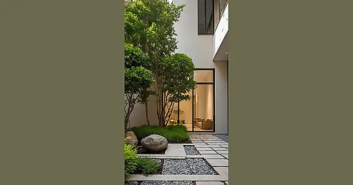 Seriously, this garden layout is so neat, even my messy locker is jealous. The way the flat stones are laid out with the dark pebbles makes it look like a game board, just waiting for someone to walk across. And check out the view through that huge glass door – it’s like the garden is saying, “Hey, the inside’s pretty cozy too, but aren’t we just the coolest spot right here?” It’s got that relaxed vibe that makes you want to put your feet up, maybe hum an Italian tune, and forget everything else exists.