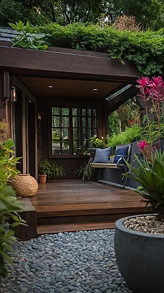 Imagine this: you’re chilling on a cozy bench, nestled under a roof covered in lush greenery – like a mini-rainforest sprouting right out of your Canadian home! The picture shows a gorgeous porch, all decked out with comfy cushions, perfect for reading a book or just soaking up the peaceful vibes. This isn’t your average porch; it’s a little slice of paradise, complete with a pebbly pathway and exotic plants adding a touch of “wow” to your typical Canadian garden. It proves that even in Canada, you can create a backyard escape that feels like a tropical getaway!