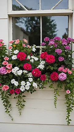 These window box flowers are basically the ultimate curb appeal upgrade, like giving your building a colorful glow-up. They’re like little plant parties happening right outside your window, showing off their cool colors – look at those fancy white roses and bright purple ones in the picture! It’s like they’re saying, “Hey world, check out how awesome we look just chilling here.” They make your window ledge look way happier, like it just put on its best outfit for the day. Plus, it gives the neighborhood squirrels something interesting to ponder besides burying nuts.