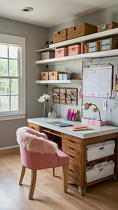 The best part? No excuses for a messy desk! With all that storage, every marker, bead, and sticker has its own little home. It’s like a crafting command center, ready to tackle any project, from building a diorama that’ll blow your teacher’s mind to finally finishing that friendship bracelet you started last summer. Get ready to unleash your inner artist and your inner neat freak – because this room is ALL about getting creative, while staying super organized.