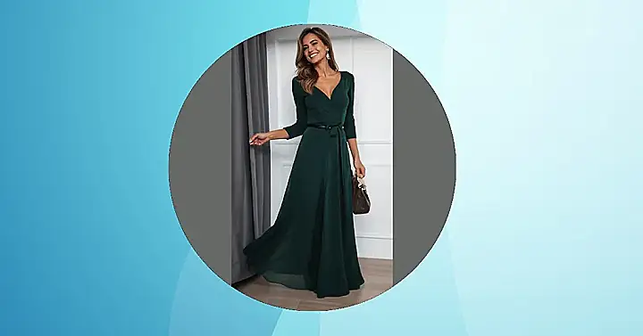 The picture shows a woman rocking a stunning teal maxi dress, and let me tell you, she’s giving off major “I’m the boss” vibes. This dress is everything a grade 9er could want for a fancy event, like a school dance or a family wedding. It’s got that flowy, effortless look that makes you feel like you’re gliding across the dance floor, without being too over-the-top. Plus, it’s the perfect shade of teal to make you stand out from the crowd.