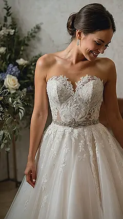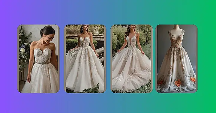 This stunning wedding dress isn’t your grandma’s traditional white! While it’s mostly a gorgeous, flowing off-white, the beautiful lace detailing adds a touch of elegance and maybe just a hint of “something blue” if you squint. It’s like a princess dress but with some serious modern flair—perfect for a bride who wants to shine without being overly flashy. The bride in the picture looks like she’s ready to walk down the aisle and into a fairytale sunset, which, let’s be honest, is every girl’s dream!