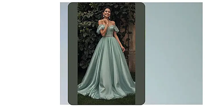This ball gown is so dreamy, it’s like stepping into a princess movie! Just imagine twirling around in this beautiful, flowing dress – you’d feel like you could conquer anything! The off-the-shoulder design adds a touch of modern flair, and that sparkly necklace? Pure magic! It’s the perfect outfit for a special occasion, whether it’s prom, a fancy party, or even just a really epic day at the mall (with a stop for ice cream, of course!).