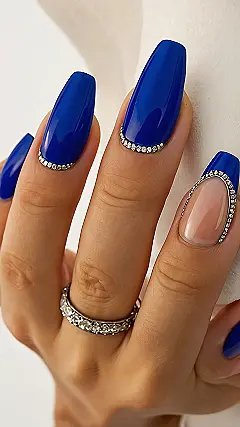 Getting ready for prom feels like a huge deal, and let’s be honest, your nails have to be just as ready as you are! Looking at these gorgeous blue nails with all that sparkle reminds you that your fingertips can totally be part of your amazing prom look. Imagine showing up with nails this cool – you’d practically need sunglasses just to look at your own hands because of all the shine! These definitely aren’t your average school-day nails; they scream “I’m ready to dance all night and look fabulous doing it!”