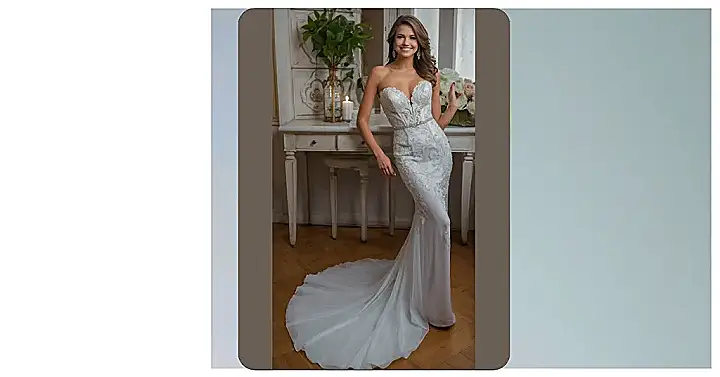 This bridal dress is giving us major fairytale vibes! Just look at that stunning train – it’s practically begging to be swept across a grand ballroom floor (or maybe just your living room, we don’t judge!). The delicate lace and the sweetheart neckline are totally dreamy, and it’s the perfect mix of classic elegance and modern chic. This dress is so pretty, it practically makes you want to plan a wedding…even if you don’t have a significant other yet!