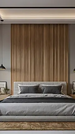 That wooden paneling behind the bed isn’t just cool, it’s practically a forest in your room, but without the mosquitos! It’s like having a giant, stylish headboard that stretches all the way to the ceiling. I bet if you listen really closely, you can almost hear the gentle whisper of, “Sleep in, you deserve it!”