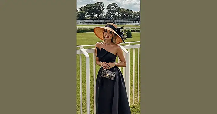 Choosing derby outfits for women is like getting permission to wear your most extra, wildest hat dreams in public, and it’s completely normal! It’s the perfect excuse to dress up and have fun with your style, whether you go for bright colors, flowy dresses, or something totally unexpected and sharp like the look in the picture. Just make sure your hat is secured tightly so it doesn’t take off when the horses bolt past – unless you want your hat to literally run with the race.