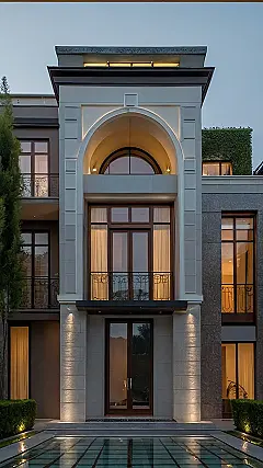 This villa’s exterior totally nails that “modern classic” thing. It’s like if your grandma’s fancy mansion had a baby with a super cool, minimalist art gallery. The building has this old-timey charm with the arch window and little balconies, but also some sleek lines and cool lighting that scream ’21st century baller pad.’ Who knew mixing old and new could look so awesome?