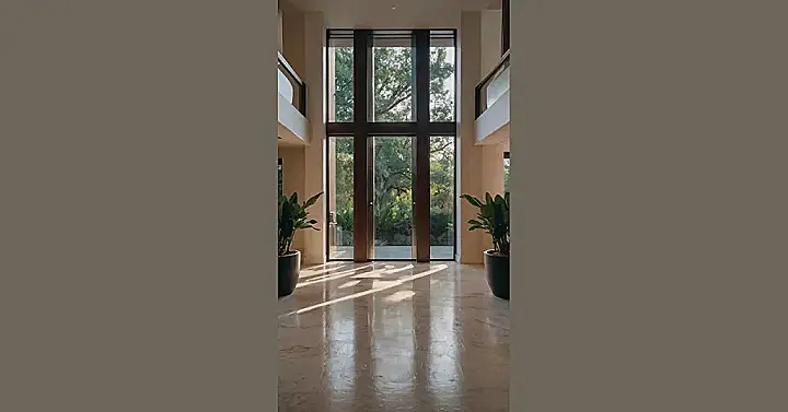 This picture is like something out of a fairytale! You can tell this house is special just by looking at the entrance. Imagine walking through those giant doors, the shiny marble floor reflecting the light pouring in from the windows. It’s like stepping into a magazine, isn’t it?
