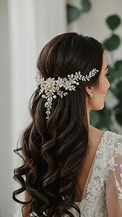 Choosing this hairstyle is basically the cleverest move ever for a wedding! You get all the benefits of having hair mostly out of your face, so wind gusts or enthusiastic hugs won’t turn you into a tangled mess. Yet, you don’t miss out on the fun, bouncy volume that having hair down gives you. It’s the ultimate balance! The accessory just ups the ante, making it sparkle like a fairy tale while keeping everything perfectly in place so you can focus on important stuff, like not tripping down the aisle or figuring out how to dance in heels.