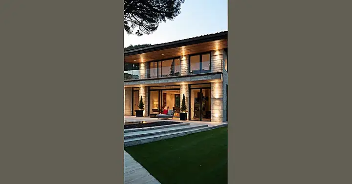 So, imagine this house plopped down in the French countryside! It looks super modern and fancy, like something you’d see in a movie where the characters are all rich and sip champagne. But there’s a cool contrast; it’s got a little bit of a rustic vibe with all that stone, making it feel like a comfy, expensive, countryside chateau.