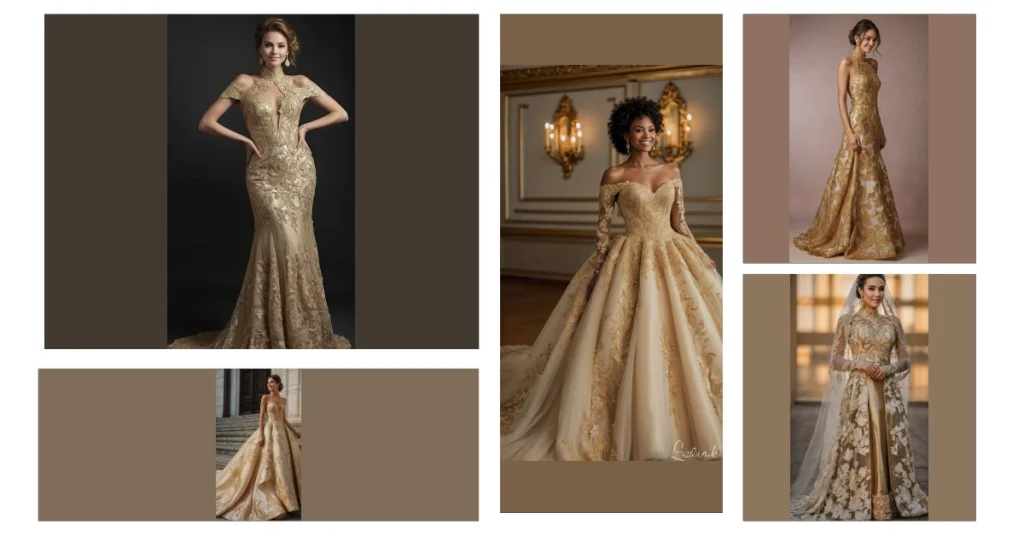 Okay, all you glam queens out there! Have you ever thought that a little gold goes a long way? Well, let me tell you: a gold wedding dress isn’t just a fashion statement; it’s a glorious, show-stopping spectacle! Picture yourself walking down the aisle, hair flowing, in a gown that glistens brighter than champagne bubbles – and trust me, the wedding guests will be popping their fizzy drinks in awe!