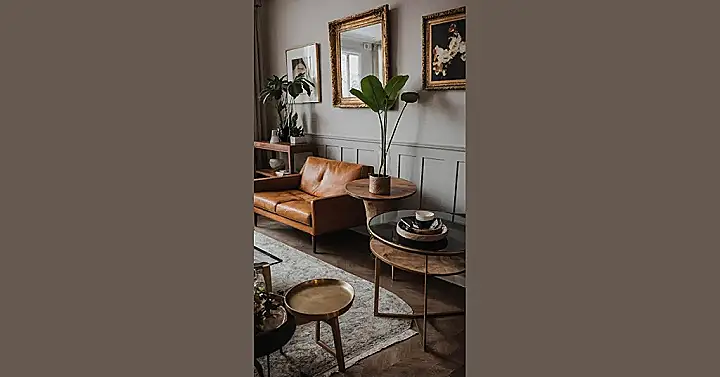 Notice all the different little tables and shiny gold accents? It’s like each piece has its own personality, from the tall plant standing proud in the corner to the big, fancy mirror that probably sees all the fun. This room feels like it has stories to tell, not just about decorating, but about good times and being comfy. It’s the kind of place where you can actually relax and not worry about everything being perfectly symmetrical – because who wants a living room that looks like it’s trying too hard?