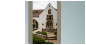 This house is like something straight out of a movie! It’s got all the classic Mediterranean vibes: a warm yellow color, arches everywhere, and even a little bit of a patio with grass growing between the stones. It looks like a place where you could relax on a hot summer day with a glass of lemonade and a good book, maybe even with a gentle breeze blowing through the trees.