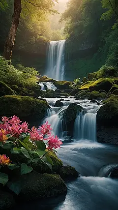 This picture is like a secret garden for your phone! Imagine having this unbelievably beautiful waterfall as your background. It’s so peaceful; it’s practically whispering, “Relax, it’s okay to stare at pretty things all day.” The mossy rocks are like tiny green pillows, and the water tumbling down is so smooth, it looks like a magical silk ribbon. You could totally get lost in this dreamy scene, especially if you’re dreaming about a vacation where you can splash around in a waterfall and become one with nature.