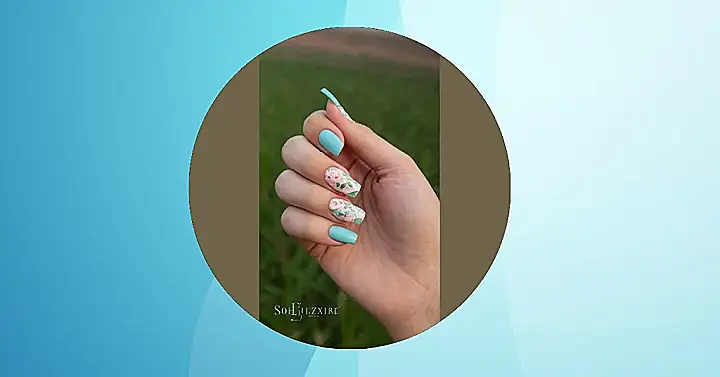 Okay, so check out these nails! They’re like someone took a baby blue sky and then decided to plant a whole bunch of cute little roses on a couple of them. It’s the kind of look that says “I’m chill, but I also have a secret garden growing on my fingertips.” Just try not to get distracted staring at them during Mr. Henderson’s history lecture.