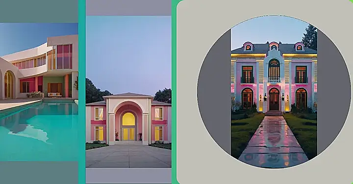 This house is a total dream! Just look at that bright pink facade, with its fancy details and glowing lights. It’s like something out of a fairytale, but way cooler! Imagine all the parties you could throw in a place like this – you could have a dance party in the grand hallway and invite all your friends to a sleepover in one of the super fancy bedrooms. You might even find a secret passage or a hidden treasure room behind one of those cool arches!