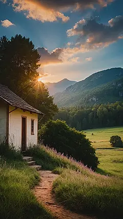 Nestled between towering mountains, the lush green valleys reveal their beauty as dawn breaks, painting everything in a gentle golden hue. With the sun rising slowly on the horizon, warm rays filter through the delicate leaves, creating a dappled dance of light that plays across the soft terrain. The fragrance of wildflowers and dewy grass fills the air, inviting a sense of calm that permeates every inch of the serene landscape. Birds begin their morning symphony, weaving a tapestry of sound that blends harmoniously with the rustling leaves, as if nature itself is greeting the day with quiet joy.