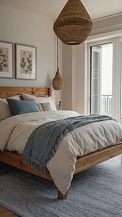Seriously, who needs a rainforest when you’ve got this? Between the calming colors, the natural textures (hello, gorgeous wooden coffee table!), and those amazing lamps that look like they’re made of sunshine, this room is basically a hug. It’s the perfect spot to curl up with a good book (or your phone… we won’t judge!) and just relax. This is what dreams are made of—or, you know, what a perfectly cozy natural bedroom looks like.