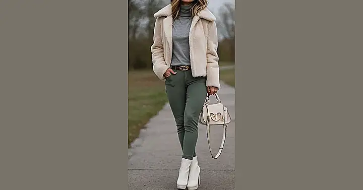 Hey there, fashion friends! Check out this awesome winter outfit! It’s like a super stylish blend of “western cool” meets “cozy winter vibes.” Imagine this: you’re strolling down a snowy street (or maybe just pretending!), feeling all warm and toasty in your creamy-white jacket. It’s like a cloud you can wear, and those olive green pants are seriously the perfect contrast – kind of like the mountains meeting a winter sky. And don’t even get me started on those cute white boots – they’re the finishing touch that screams, “I’m ready to take on the snow, one fashionable step at a time!”