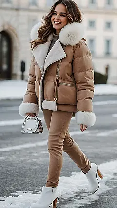 Hey there, fashionistas! Check out this amazing outfit – it’s like a western movie star met a snow princess and decided to go for a stroll! That super-cozy, camel-colored puffer jacket with the fluffy white trim is seriously stylish. It’s the perfect mix of rugged western vibes (think cowboys and cowgirls!) and super-soft winter warmth. Plus, those matching pants and white boots? They’re like a winter dream come true. I bet she’s toasty warm while still looking absolutely fabulous!