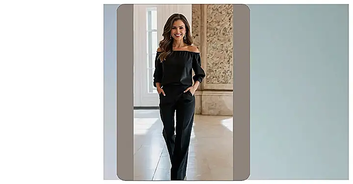 This outfit is total Christmas party goals! Imagine yourself gliding into a fancy Christmas party, feeling like a total queen in this chic black jumpsuit. It’s so stylish, it practically screams “Merry Christmas!” without even trying. The off-the-shoulder top adds just the right touch of elegance, while the sleek pants ensure you’re comfy enough to dance the night away. Forget reindeer sweaters – this is how you do festive fancy!