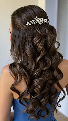 Getting ready for a wedding can be a bit of a mad dash, right? But your hair doesn’t have to be! This look is all about keeping it classy without spending hours in front of a mirror. The half-up style keeps things neat and lets your face shine, while the loose curls add a touch of fun. Plus, who can resist a cute flower and some sparkly clips? It’s the perfect balance of simple and stunning.