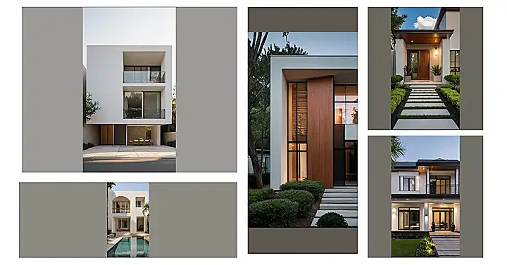Imagine a house so neat and tidy, it practically cleans itself! That’s what we’re talking about with sleek minimalist homes. Check out that entrance – no crazy decorations, just a cool wooden door, some plants that don’t require a ton of attention, and a walkway that looks like a zen garden for your feet. You wouldn’t find your parents tripping over forgotten toys here.