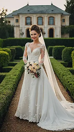 And that’s not all! The long sleeves are super chic, adding a touch of sophistication, and the train is long enough to make a dramatic entrance. The best part? You can totally picture her twirling around the dance floor, feeling like she’s floating on air, scattering sparkles as she goes! It’s the perfect combination of timeless grace and modern flair – and let’s be honest, that’s what every bride deserves on her big day.