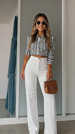 This girl is rocking the classy look! It’s like she walked straight out of a fashion magazine. Her striped shirt is super cute, and those white pants are giving her legs for days! It’s all about the details, right? She’s even got a cute little purse to match. Let’s be real, this outfit is totally giving off those “I’m ready to take on the world” vibes. Plus, she looks super confident and happy – which is the real key to looking classy!