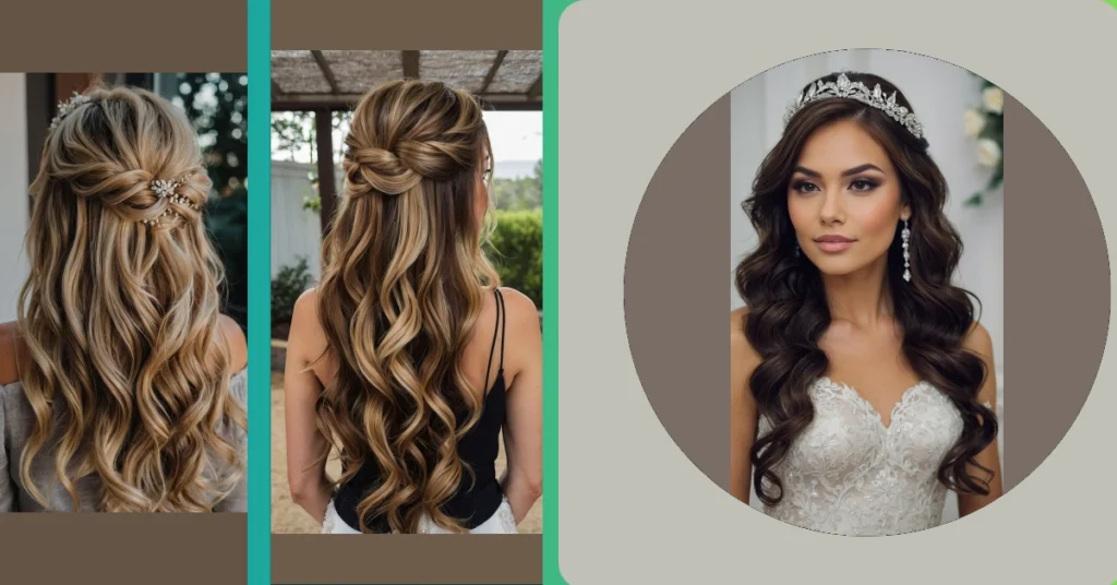 Ever dreamed of a wedding hairstyle that strikes the perfect balance between elegance and effortlessness? Picture yourself walking down the aisle with cascading waves gracefully pinned up in a half-up, half-down style. This dreamy look combines the best of both worlds – the glamour of a sophisticated updo with the romantic allure of loose, flowing locks. The soft curls framing your face delicately complement your bridal ensemble, adding a touch of whimsy to your overall look. It’s the kind of style that whispers romance and sophistication in equal measure, making you feel like a modern fairytale princess on your special day.