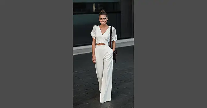 This outfit screams “sophisticated,” but in a way that’s totally relatable. Imagine strolling through a fancy museum or sipping lemonade on a sunny patio – this cream-colored dream is perfect for either! The wide-leg pants are so comfy, you’d forget you’re wearing anything at all, which is the mark of a true fashion icon. Plus, the puff sleeves on the blouse add a touch of whimsy; they’re like little clouds of elegance surrounding you. It’s the perfect mix of classic and modern, proving you don’t need diamonds to shine!