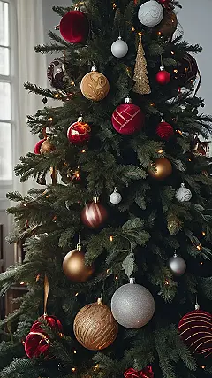 This Christmas tree is decked out with some seriously fancy ornaments! It’s like someone went to a fancy store and bought all the most beautiful decorations. There are glittery silver balls, gold ornaments with swirls, and even some red velvet ones that look super soft. It’s a real eye-catcher, wouldn’t you say?