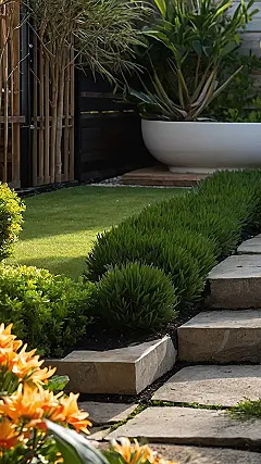 This garden is seriously awesome! Imagine coming home every day to this little slice of paradise. It’s like a mini-vacation right outside your back door! That stone pathway looks super comfy for barefoot strolling, and the perfectly manicured bushes and bright orange flowers? They’re the ultimate mood boosters, especially after a long day of school. It’s the kind of front yard that makes you want to grab a lemonade, settle in, and just enjoy the peaceful vibes.
