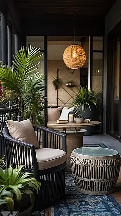 This balcony is seriously goals! Just picture yourself unwinding in that comfy wicker chair, surrounded by lush plants and the warm glow of those awesome hanging lights. It’s like a little slice of paradise, right outside your door. Forget boring old concrete – this space shows how easy it is to transform a small outdoor area into a relaxing oasis, perfect for reading, sipping tea, or just enjoying the evening air. The mix of plants and the soft rug makes it cozy, while the lights add a magical touch – way better than just a regular old lightbulb!