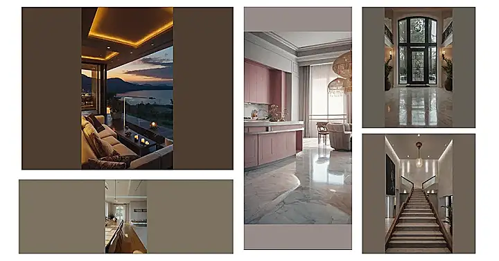 This house interior is so fancy, it’s basically a grown-up version of your dream bedroom! Just imagine sinking into that comfy sofa, maybe with a hot cocoa in hand, as the sun dips below the horizon and paints the sky in amazing colours. It’s like having your own private movie theatre with the best view ever!