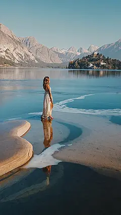 This picture screams “Europe wallpaper”! Just look at that gorgeous lake, surrounded by mountains and a cute little village. It’s like something out of a fairytale, except instead of a princess, we’ve got a girl in a flowy white dress, ready to conquer the world, or at least this amazing scene. It’s like she’s walking on water!