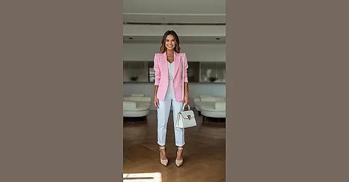 This lady is rocking a pink blazer and white pants, giving off major boss vibes! It’s like she’s ready to take on the world, one stylish step at a time. Her outfit screams “confidence” and “I know I look good,” but also has a touch of playful charm with the pop of pink. Imagine showing up to school in this outfit – you’d definitely turn heads!