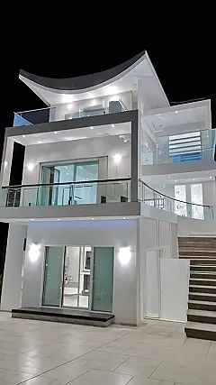 This house is like something out of a futuristic movie! It’s super modern and clean-looking, with all those right angles and glass railings. I bet parties at this house are next-level cool. The lighting makes it look extra fancy, like maybe it’s where a secret agent lives when they’re not busy saving the world. The roof has this funky, curved design that’s totally unexpected, like the architect was thinking, “Let’s make it a little bit weird, but in a good way!”