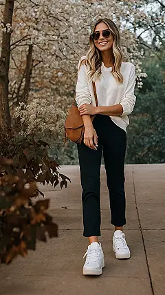 Hey there, fashion friends! Check out this super cute fall outfit – seriously, it’s giving major autumn vibes! That burnt orange sweater is perfect for chilly days, and those white pants? They’re like a breath of fresh air amongst all the fall foliage. Imagine strolling through a park all decked out like this – you’d be the most stylish leaf-peeper around! The white platform boots are the cherry on top – super comfy and totally on trend. It’s the perfect blend of cozy and chic, which is basically the fall fashion motto, right?