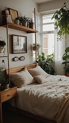 This bedroom is seriously giving me all the cozy vibes! Imagine snuggling up with a good book (or maybe binge-watching your favorite show) in this super chill space. Those wooden shelves overflowing with plants are like a little jungle paradise, but in a totally organized and stylish way. I bet it smells amazing in there, like fresh earth and maybe a hint of that new book smell. It’s the perfect spot to escape the craziness of life and just relax amongst the greenery – seriously, who needs a vacation when you’ve got a corner like this?