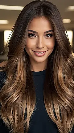 The image shows a girl with gorgeous long brown hair that’s been given a balayage treatment. Balayage is like giving your hair a super cool makeover, but instead of just one color, it uses lighter shades that blend together in a super natural way. It looks like the sun kissed her hair, giving it all kinds of beautiful highlights! It’s like a little bit of summer sunshine even when it’s chilly outside.