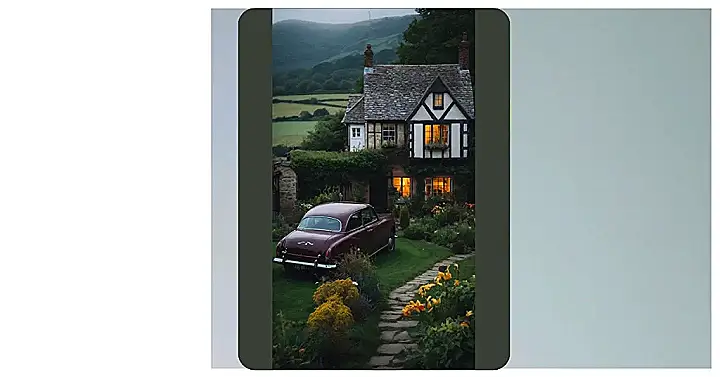 This charming English village house looks like it’s straight out of a storybook. With its half-timbered walls, stone roof, and cozy glow from the windows, it practically begs you to step inside and enjoy a cup of tea by the fire. The classic car parked in the driveway adds a touch of vintage elegance, and the winding stone path leading up to the front door seems to whisper secrets about the life that unfolds inside.