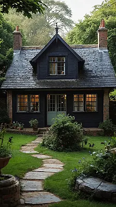 You might be wondering what the big deal is about this house. Well, it’s not just a regular old cottage, it’s got a unique charm and personality. The black paint makes it look mysterious and magical, and the stone path whispers secrets of adventures yet to be had. It’s like something out of a book, and I bet there are stories waiting to be told inside those walls!