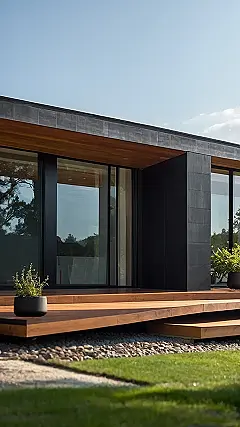 Imagine a house so neat and tidy, it practically cleans itself! That’s what we’re talking about with sleek minimalist homes. Check out that entrance – no crazy decorations, just a cool wooden door, some plants that don’t require a ton of attention, and a walkway that looks like a zen garden for your feet. You wouldn’t find your parents tripping over forgotten toys here.