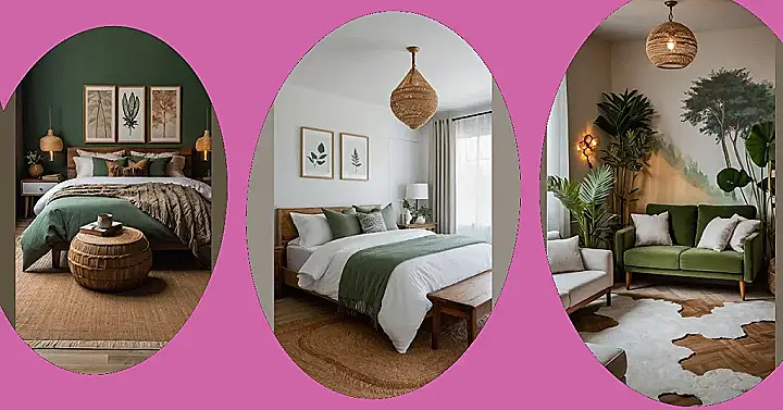 This bedroom is totally channeling some serious chill vibes from nature! Imagine waking up here, feeling like you’re sleeping in a fancy treehouse… but with more pillows. Everything from the leafy artwork to the woven light fixtures screams “earthy awesomeness.” Just try not to accidentally water the lamps, thinking they’re plants.