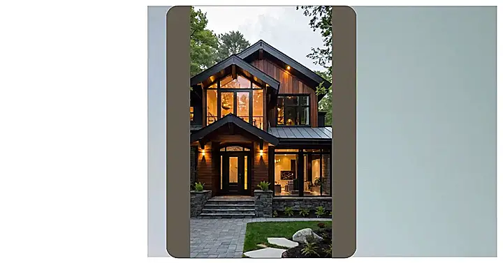 Look at that garage door! It’s like a giant slab of shiny wood, begging to house a sweet ride… or maybe just a bunch of bikes and skateboards, let’s be real. The little lights on the steps are a nice touch, so you don’t trip and faceplant on your way to the pizza fridge. This house basically says, “Yeah, I’m stylish, but I also like to have fun.”