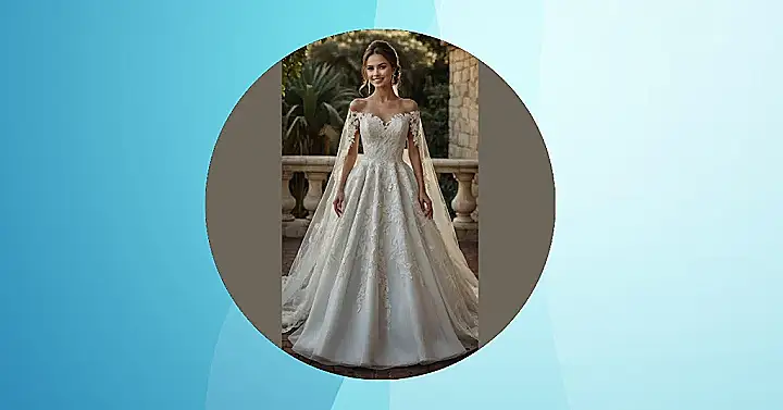Picking out a dress that makes you feel like royalty is part of the fun of thinking about ‘dream wedding dresses’. This gown, with all its swirly patterns and off-the-shoulder elegance, is the kind that makes you stop scrolling. Just imagine trying to eat pizza or play charades at the reception while wearing a dress with a train this long – it would be an adventure! But hey, dreams are meant to be a little extra, right? And this dress is definitely extra in the best possible way.